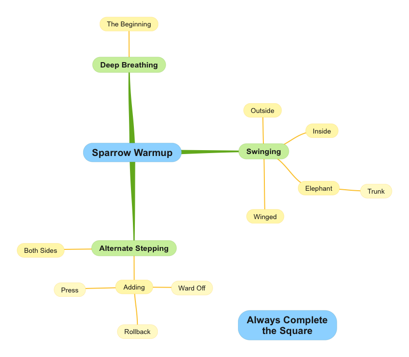 The purpose of the warm up exercise is to develop independence of motion with the basic moves of the form. The idea of moving diagonally is fundamental to managing incoming force. The square forces your mind to understand the movement in all directions, both moving forward and backward.